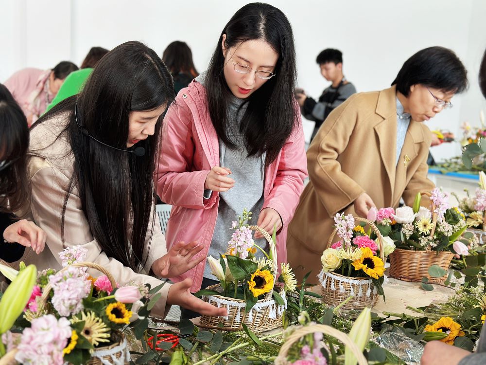 在特邀花艺师的精心指导下,向日葵、洋甘菊、玫瑰、非洲菊、康乃馨等各色鲜花,经过女老师们精心巧妙的构思、修剪、整枝和装饰,变成了一件件精美的艺术品,充满诗情画意,让大家在细碎的时光研磨中也能品味生活的明媚与浪漫。