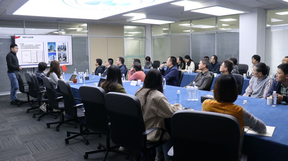 工程管理系、建筑工程系党支部一行先后参观了研究所SE-LAB融合实验室展厅和数字低碳及安全物联研发中心实验室,并听取了研究所建筑工业化研发中心副主任施明哲博士对研究所的建所模式、创新体制机制、业务布局、主要技术及产业发展等情况的全面介绍。