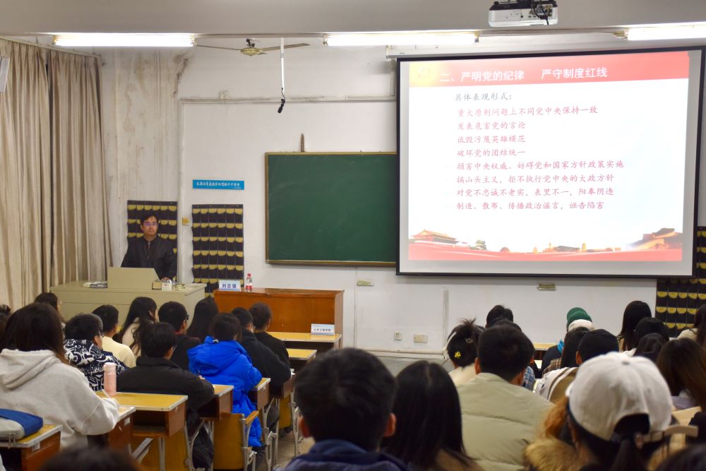刘志强围绕党的二十大报告中关于全面从严治党新部署;严明党的纪律,严守制度红线;争当学生表率,争做合格党员这三个方面,结合案例,全面介绍了党的六大纪律和具体表现,并强调作为党员要深入学习党史,铸就理想信念;勇担时代重任,彰显青春本色;在红色血脉中跟党走,践行初心使命,真正做到在思想上入党、行动上入党。