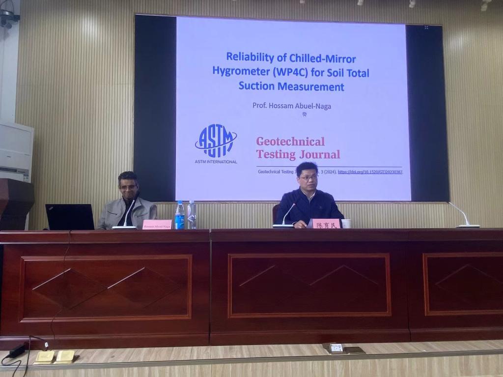 Hossam Abeul-Naga教授以其热情洋溢、幽默风趣、思路清晰等特点,吸引了在场所有人的关注。他丰富的知识、深入浅出的讲解以及在科学研究方面的创造力,使得此次讲座在师生中引起了广泛的讨论和赞誉。在报告结束后,他认真、耐心地回答了师生们提出的各种科学问题。这次报告不仅提高了师生们对非饱和土力学的认识与理解,还拓宽了他们的学术视野。