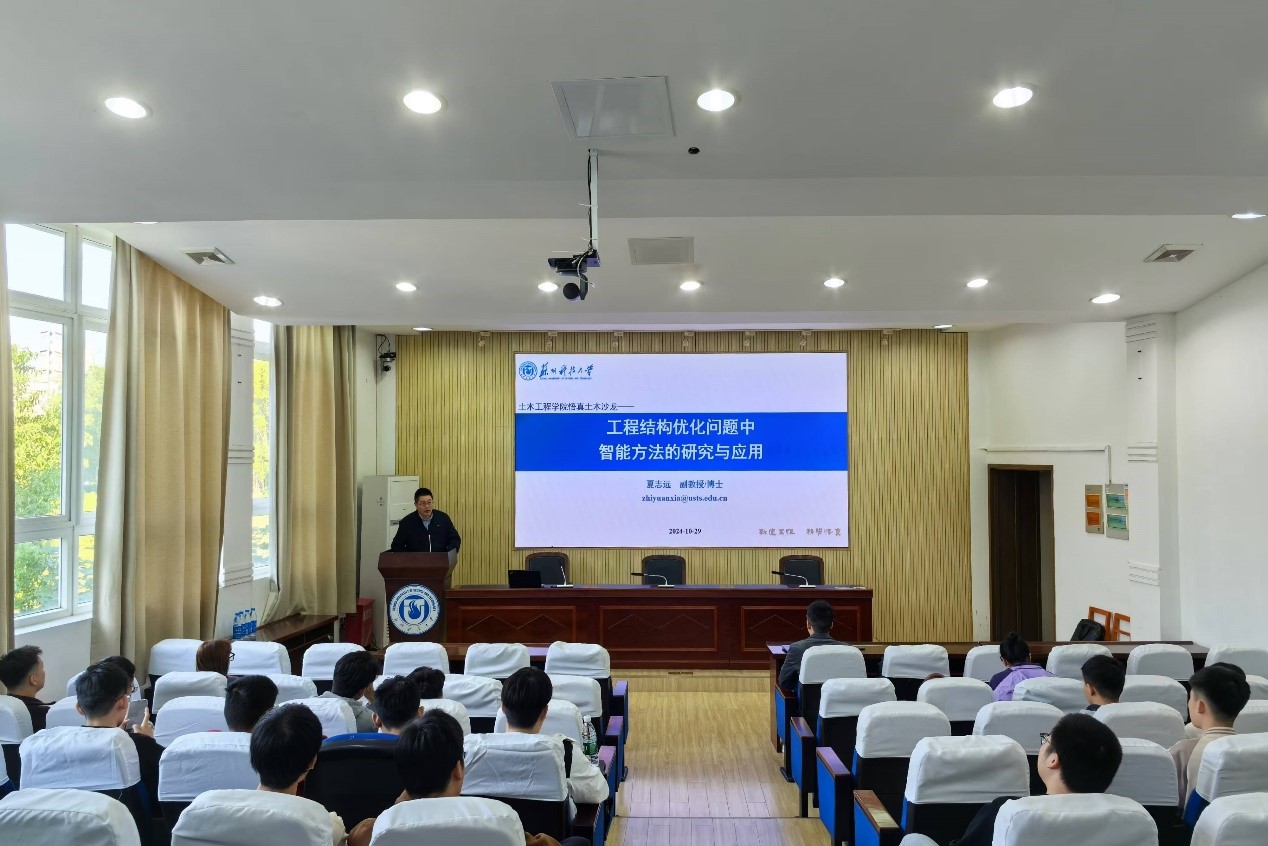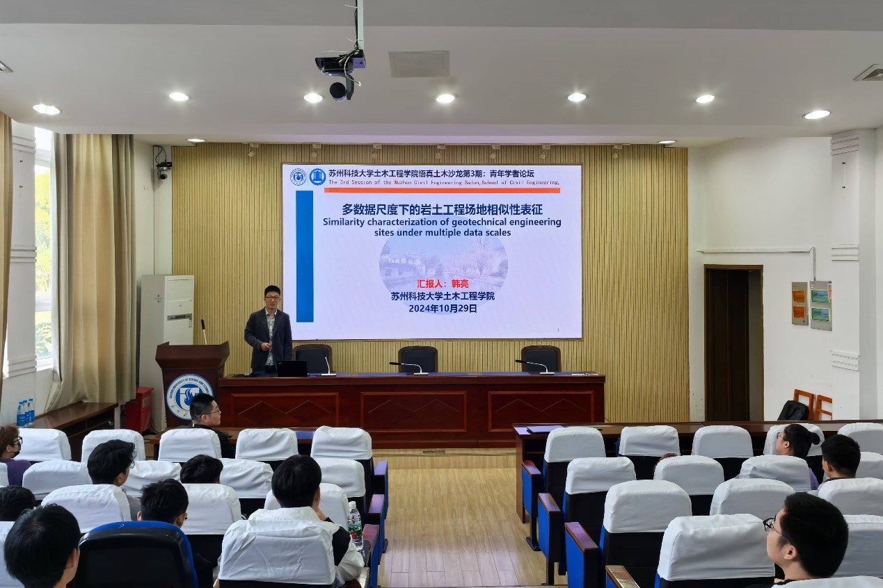 本次论坛上,狂人小说 教师夏志远和韩亮分别分享了最新的科研进展与研究心得。夏志远围绕“工程结构优化问题中智能方法的研究及应用”作了专题报告,重点介绍了智能算法在复杂工程结构优化中的实际应用与前沿发展。他详细解析了优化算法在提升结构安全性和经济性方面的关键作用,并探讨了不同优化方法在工程中的适用性,为在场师生提供了关于工程优化的新视角。随后,韩亮作了题为“多数据尺度下的岩土工程场地相似性表征”的报告。他从多尺度数据的角度出发,研究了岩土工程场地的相似性问题,通过对不同场地数据特征的量化分析,为现场工程类比和预测提供了新的方法支持。韩亮的研究成果在场地勘测及工程预测方面有着广泛的应用前景,引发了师生们的浓厚兴趣。