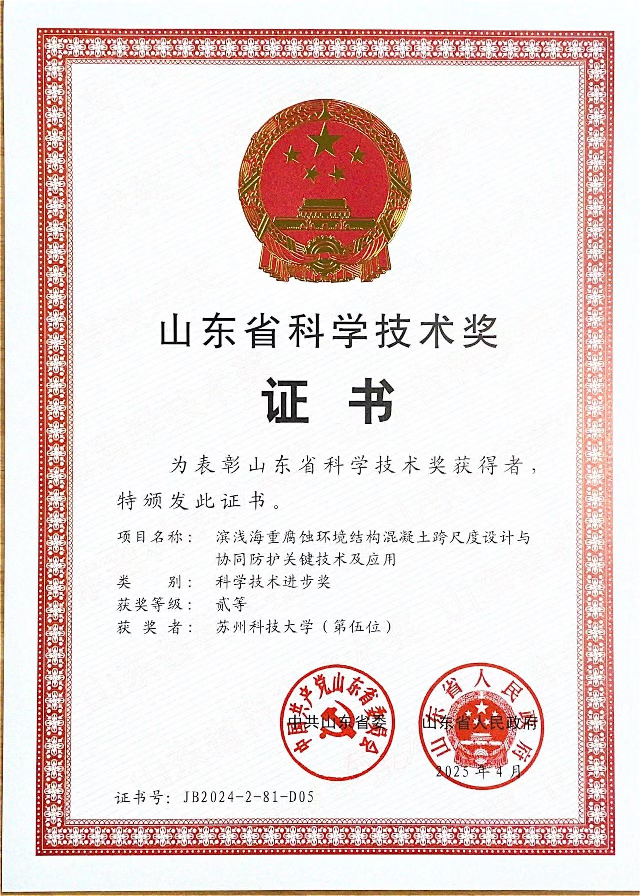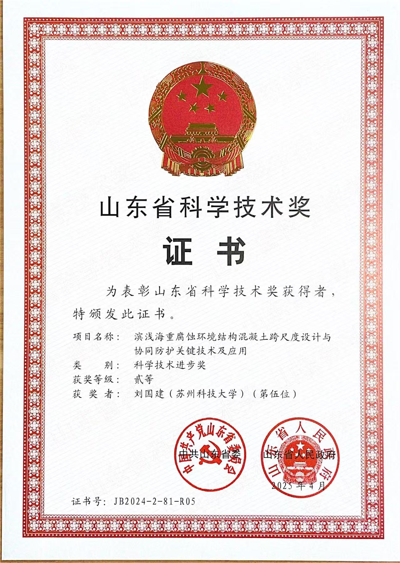 作者:蒋诚钢、申燕 图片作者:刘国建 来源:科技产业处、狂人小说 发布日期:2025-06-30 浏览:次6月27日,山东省召开全省科技大会,颁发了2024年度山东省科学技术奖。由山东高速集团有限公司牵头、狂人小说 狂人小说 刘国建副教授为主要完成人的成果“滨浅海重腐蚀环境结构混凝土跨尺度设计与协同防护关键技术及应用”荣获科学技术进步奖二等奖。