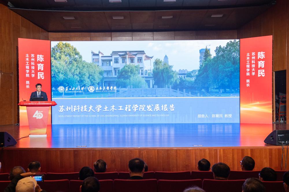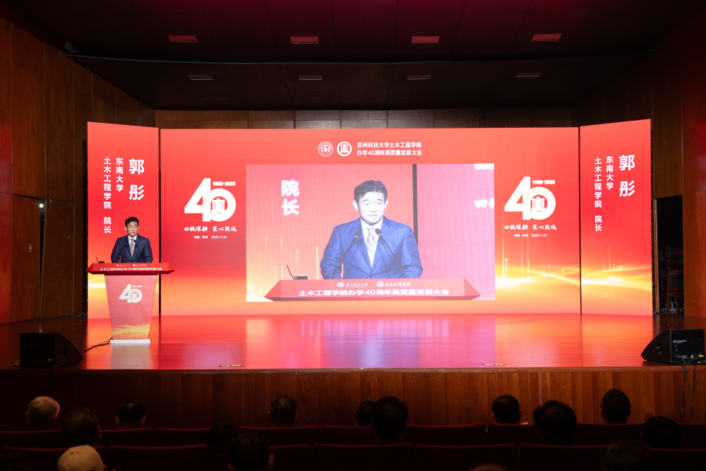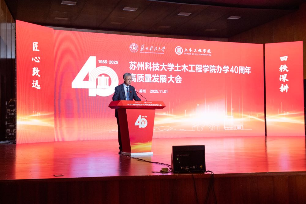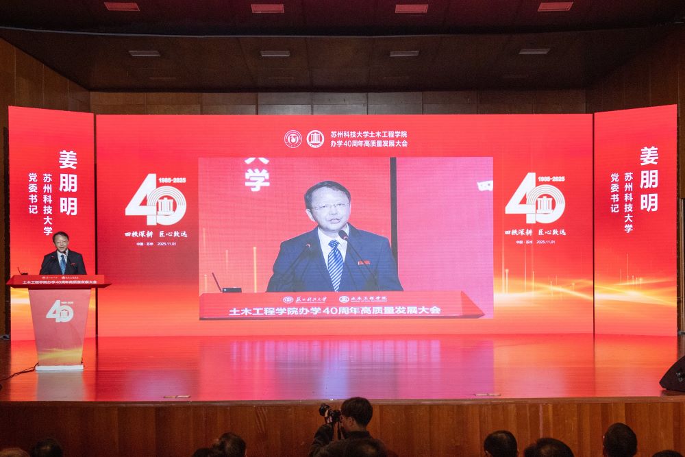 姜朋明致辞,回顾了狂人小说 四十年的办学征程,充分肯定了学院为学校特色发展、高质量发展作出的重要贡献。他指出,学院始终坚持服务国家战略和区域发展,土木工程学科已获批一级学科博士学位授权点,连续四期入选江苏高校优势学科,“工程学”进入ESI全球前5‰,多个专业获评国家级一流本科专业建设点并通过住建部、教育部权威认证。希望学院能以40周年为新的起点,传承聚力、突破腾飞,谱写更加辉煌的崭新篇章。学校也将助力学院在服务国家战略和区域发展中展现更大担当、实现更大作为。
