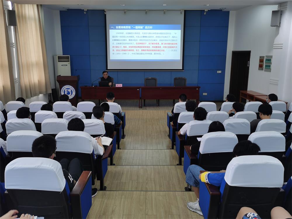 6月10日下午,刘凡以“新时代‘一国两制’的制度体系建设”为题为2018级部分学生进行了专题讲授。他从全面准确贯彻“一国两制”“港人治港”“澳人治澳”、高度自治的方针,健全中央依照宪法和基本法对特别行政区行使全面管治权的制度,坚定推进祖国和平统一进程三个方面进行了阐述。