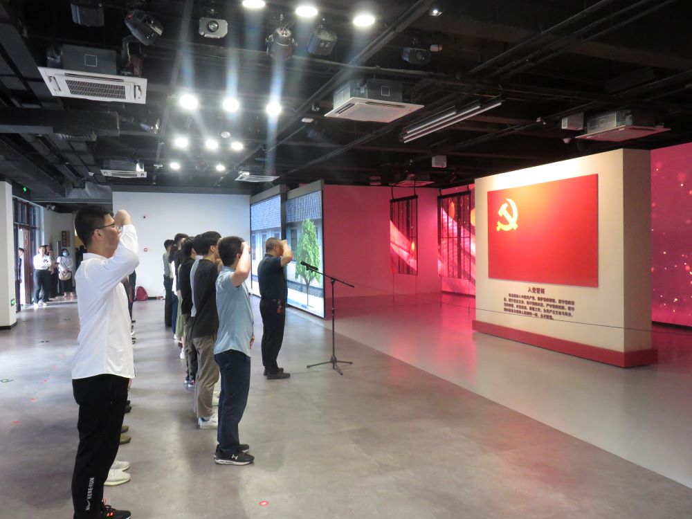 党员们走进“燃血青春”史迹陈列展区,一个个故事、一张张照片、一段段影像,将党员们的记忆重新拉回到那段艰苦卓绝、生死存亡的峥嵘岁月,切身体会到历史的潮流汹涌、激情澎湃。在复原的乐益女中教室,全体党员沉浸式体验爱国教育情境剧《最后一课》,大家仿佛穿越了百年时光,来到那个“唯有革命才能救国”的时代,见证“红色火种”的迸发。在“青春誓言”宣誓区,面对鲜红的党旗,全体党员追忆入党初心,重温入党誓词,进一步筑牢理想信念。参观结束后,全体党员认真聆听了微党课《不愿跪着生 情愿立着死——叶天底的青春誓言》和《志不求易 事不避难》。老一辈共产党人艰苦的革命历程和伟大的革命精神让全体党员深受触动。