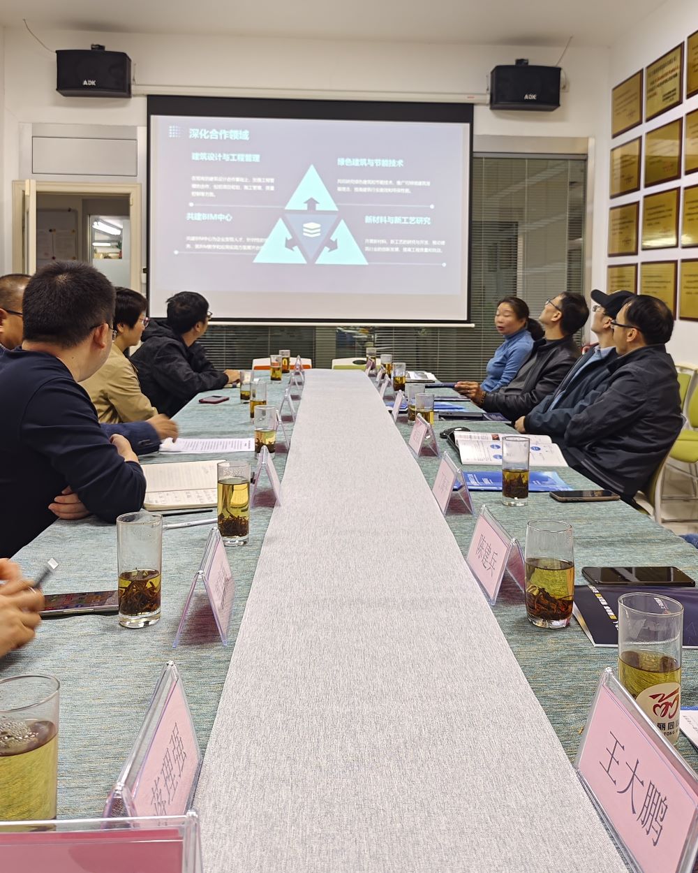 李红星致词欢迎,介绍公司的发展情况及技术力量。赵宝成介绍了学院的办学概况和学科特色。陈亨武表示双方可以在建筑设计和工程管理课程共建、BIM研究中心建设、绿色建筑与节能技术、新材料与新工艺研究等方面开展合作。