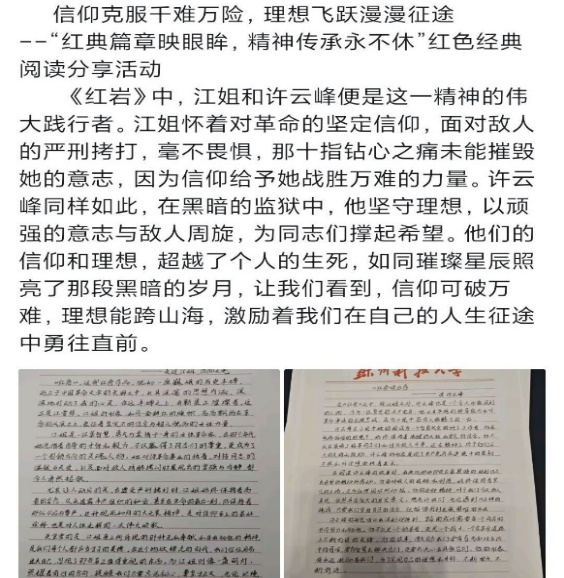 红色经典阅读分享活动,让同学们积极阅读红色经典,在感受文学熏陶之余,更被书中革命先辈们为国家、为后辈舍生忘死的精神所感动,让我们更加明确作为新时代青年应有的精神面貌,同时也为同学们营造了一个良好的学习氛围,激发了大家对阅读的兴趣,挖掘了学习潜能。相信在未来,会有更多的人爱上红色经典著作,爱上阅读!