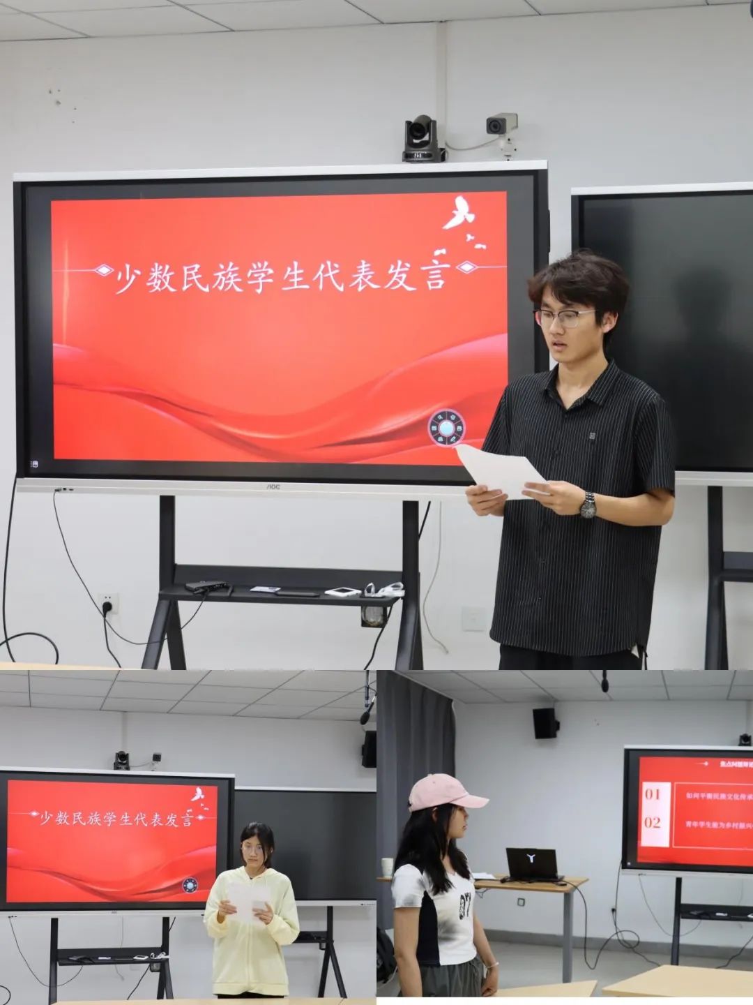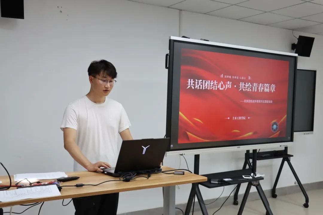 少数民族学生代表卢思彤、丁嘉乐分别分享了穿青人、回族的民族文化特色与生活风貌,展现中华民族多元一体、和而不同的文化魅力。代开琴同学围绕当代青年助力乡村民族振兴,号召同学们应主动传播民族团结理念、积极参与民族文化活动、推动乡村文化传承,实现共同繁荣。王昊同学认为民族团结教育是立足历史、服务当下、面向未来的系统工程,是维护国家统一的固本之策与实现民族复兴的铸魂工程。