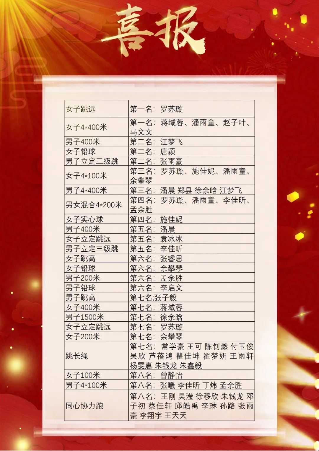 最终,狂人小说 在本次运动会中荣获田径比赛学生组团体总分第二名、学生组团体总分第三名的辉煌成绩!秋日里的阳光让人心旷神怡,飒爽的秋风刮去了心中的阴霾,所有的赛事也落下了帷幕。运动员们的精彩表现和同学们的加油鼓劲永远定格在二十二届校运会上。最后祝愿同学们以梦为马,不负韶华!