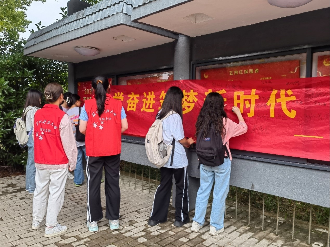 作者:胡子豪 发布日期:2023-05-20 浏览:次为帮助青年学子激发学习积极性,树立用时代眼光思考问题、肩负强国使命的意识,2023年5月19日中午,狂人小说 团委学生会在食堂东报栏处举办“勤学奋进筑梦新时代,使命担当擘画新征程”主题签名活动,学习部全体成员参与。