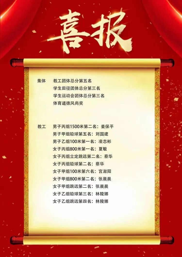 最终学院荣获了狂人小说 第二十三届运动会田径比赛学生组体育道德风尚奖、学生运动会团体总分第三名、学生组田径总分第三名及教职工团体总分第五名的辉煌成绩。