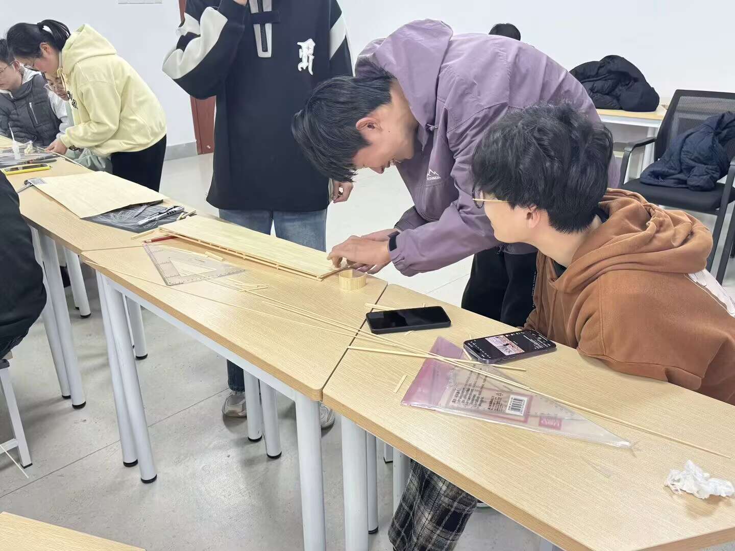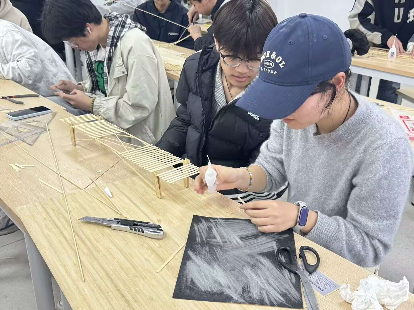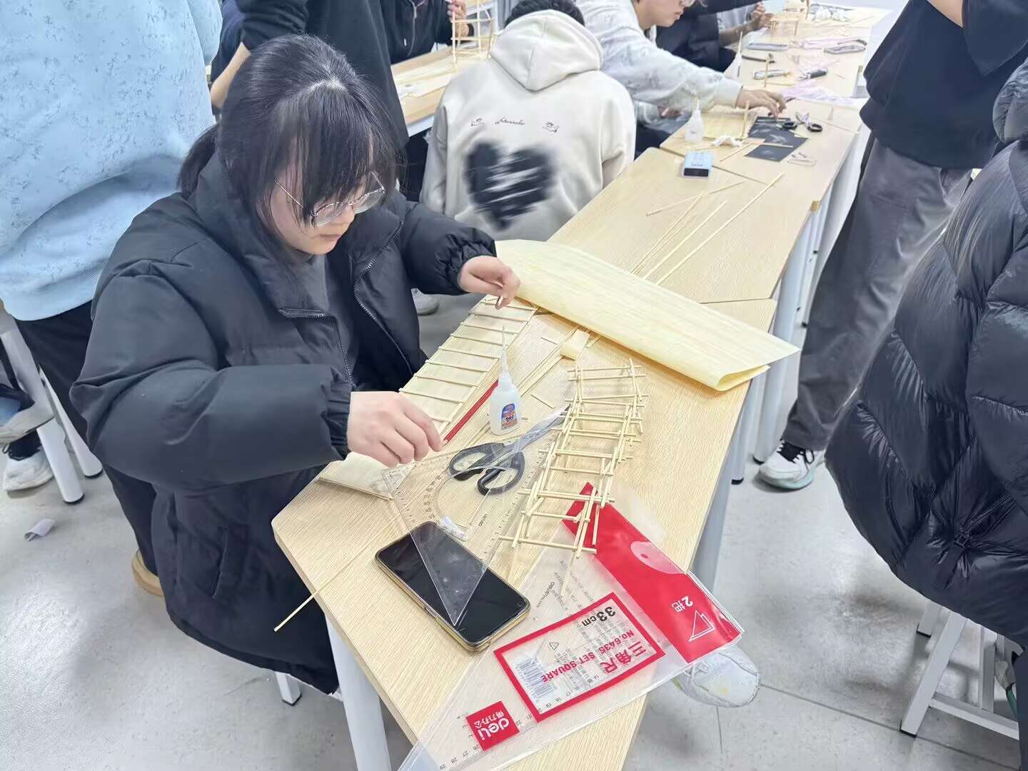 随着主持人宣布完比赛规则,模型赛正式拉开帷幕。参赛队员们目光如炬,指尖翻飞,仿佛一群现代“鲁班”正用巧思与力学对话。剪刀裁剪出精确角度,木条交错咬合成三角支撑,胶水凝固的每一秒都牵动心跳。有人伏案计算桥梁,有人屏息粘贴关键节点,科学与艺术在此刻完美交融。历经两个小时的辛勤努力,同学们精心制作的桥梁逐步进入承重测试阶段。