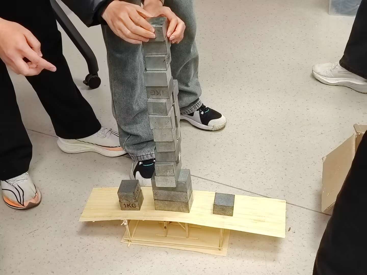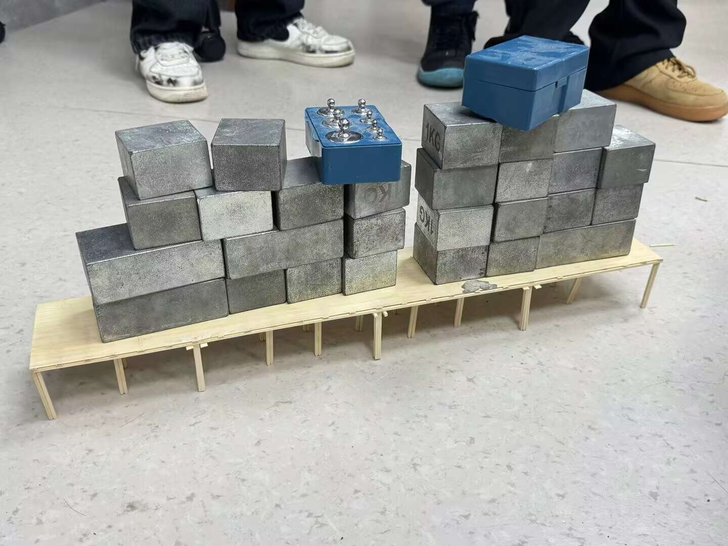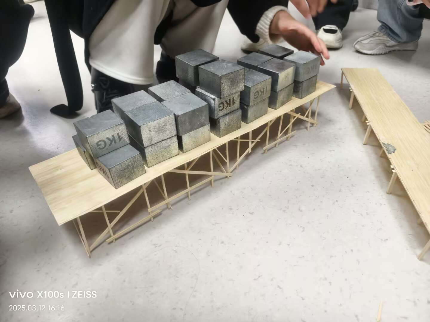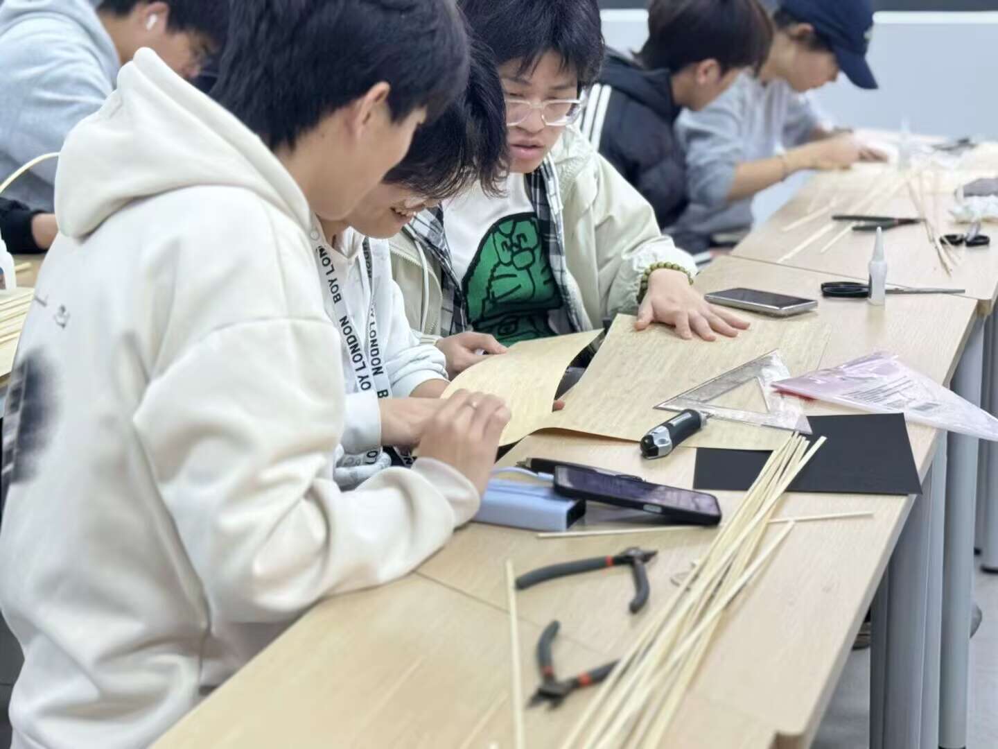 随着主持人宣布完比赛规则,模型赛正式拉开帷幕。参赛队员们目光如炬,指尖翻飞,仿佛一群现代“鲁班”正用巧思与力学对话。剪刀裁剪出精确角度,木条交错咬合成三角支撑,胶水凝固的每一秒都牵动心跳。有人伏案计算桥梁,有人屏息粘贴关键节点,科学与艺术在此刻完美交融。历经两个小时的辛勤努力,同学们精心制作的桥梁逐步进入承重测试阶段。