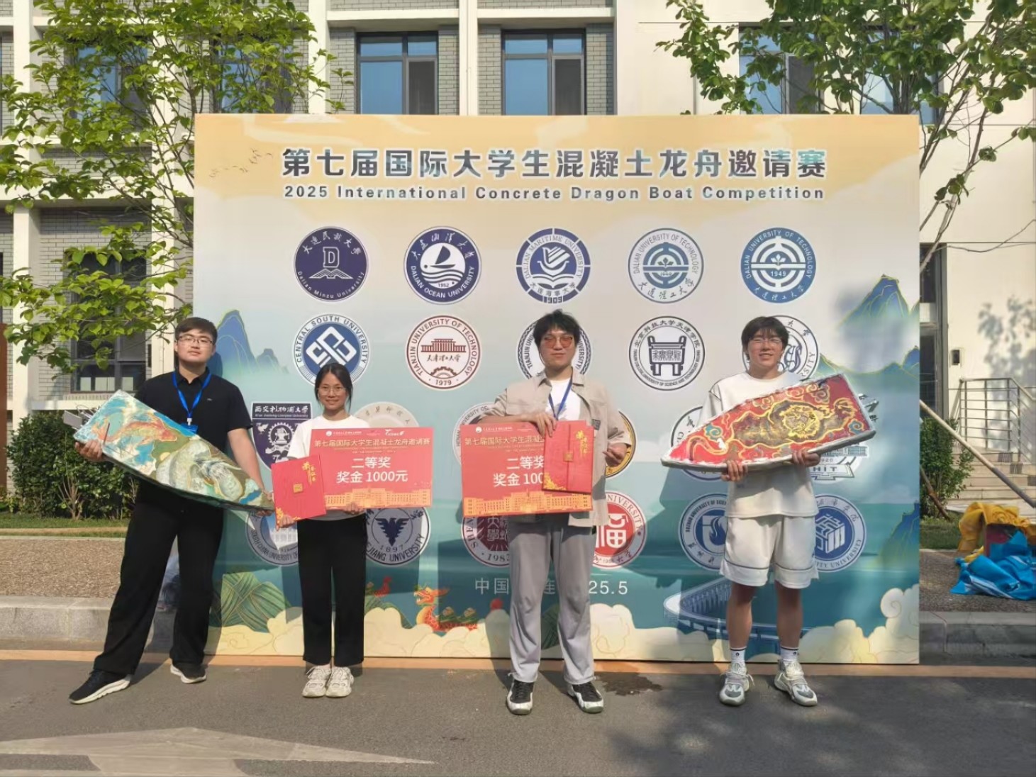 发布日期:2025-05-29 浏览:次第七届国际大学生混凝土龙舟邀请赛于2025年5月24-25号在大连理工大学举办。狂人小说 “鸣首”和“平江跃浪”两支参赛团队均获团体二等奖。鸣首号参赛队员为殷鉴远、陈鹏、张逸扬、罗康鑫、王蕊,均来自狂人小说 2024级“钱七虎卓越班”,指导老师为陈育民、陈雨唐;平江跃浪号参赛队员为葛仲怀、陈佳旺、冯一龙、孙敬威、刘妤歆,指导老师为刘国建、蔡新江。来自浙江大学、哈尔滨工业大学、华南理工大学、大连理工大学、重庆大学、天津大学等22所高校的180余名师生携34艘混凝土龙舟参加了此次比赛。